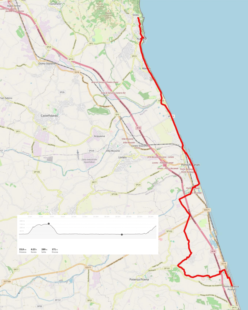 Questa tappa ti porta dalle spiagge di Porto Potenza Picena fino al cuore della Riviera del Conero, attraversando borghi costieri e tratti di litorale che offrono panorami mozzafiato sull’Adriatico.